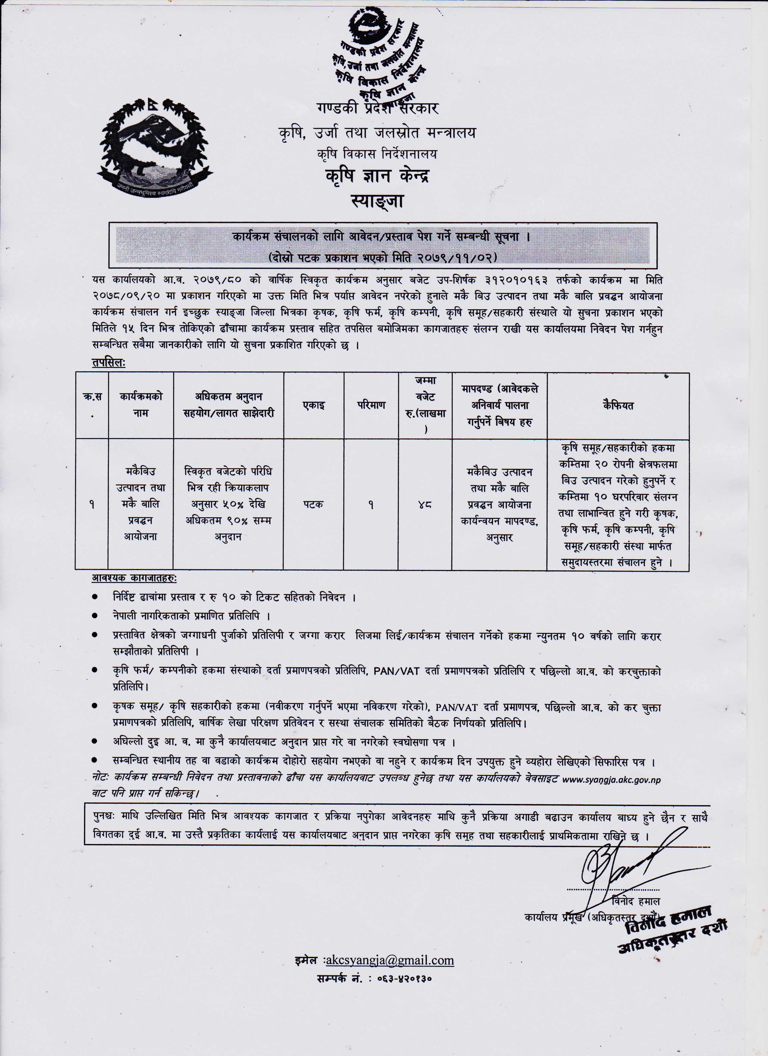 मकै विउ उत्पादन तथा मकै बाली प्रवर्धन आयोजना/मौरी घार वितरण /नयाँ बगैचा स्थापना तथा क्षेत्र विस्तार कार्यक्रम 2079-09-20 Closed !!!
