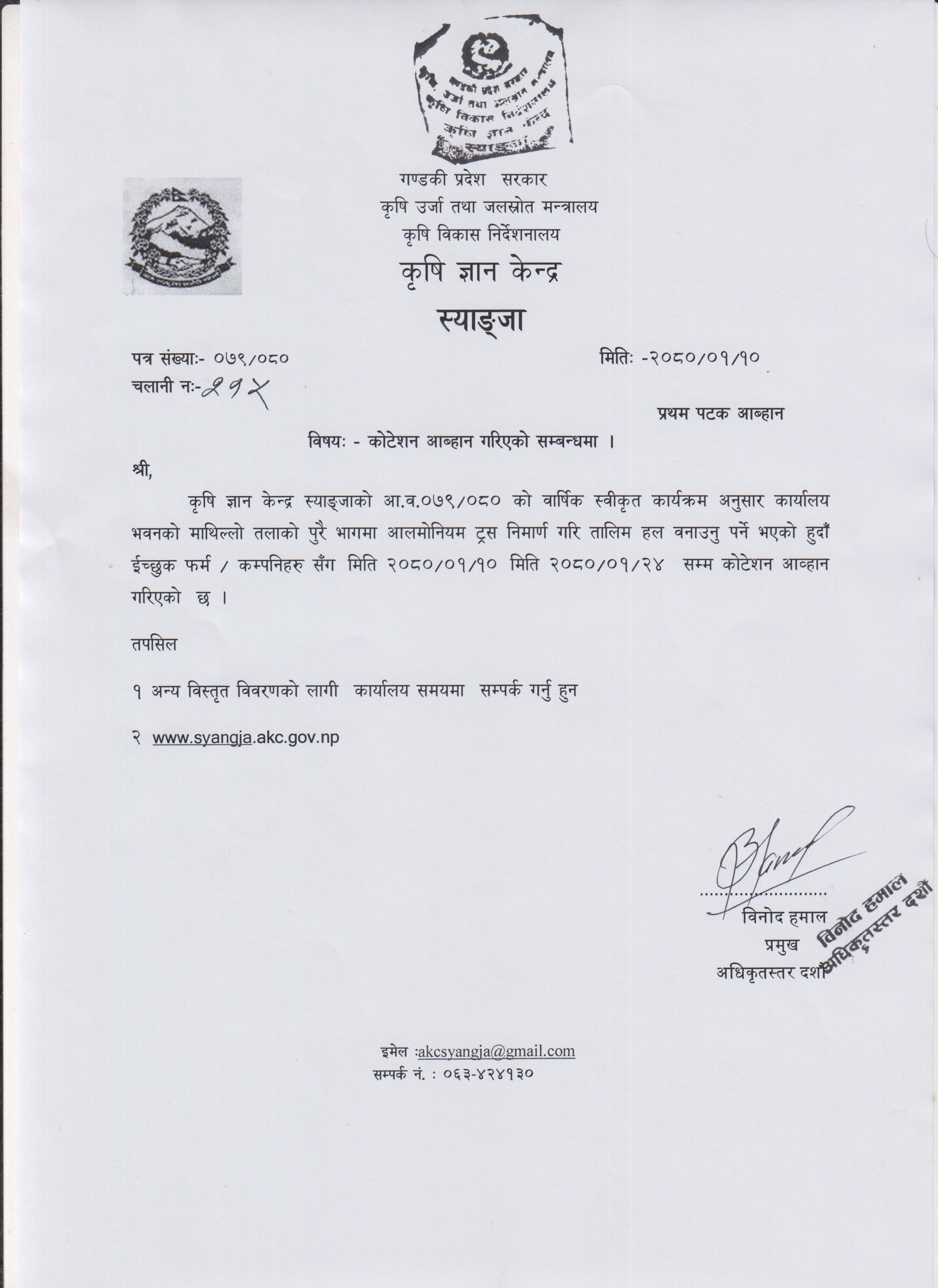कोटेशन आब्हान गरिएको सम्बन्धमा । 2080-01-10 Closed !!!